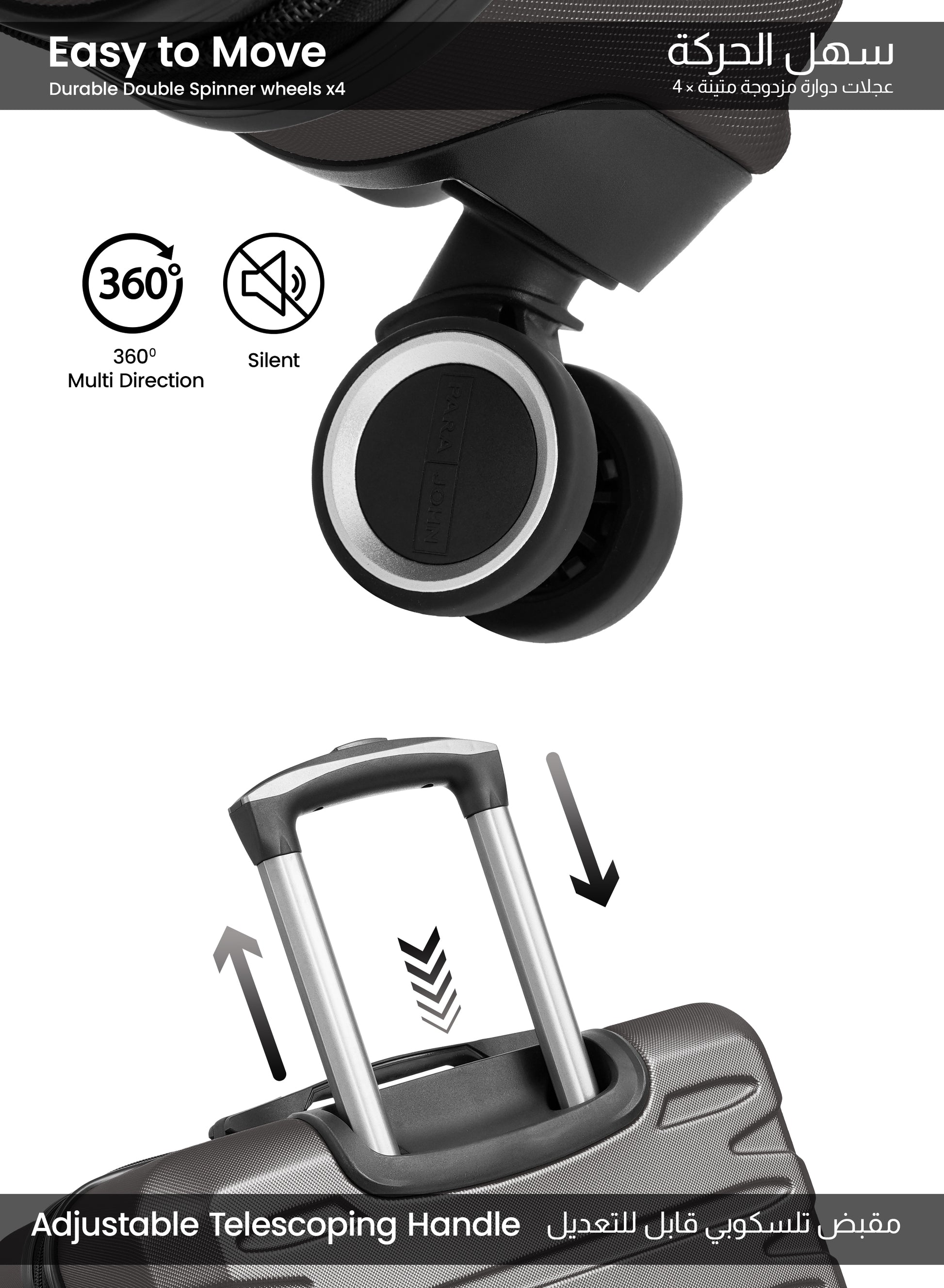 مقبض تلسكوبي قابل للتعديل:مصمم هندسيًا وقويًا لتوفير أقصى قدر من الراحة وسهولة الاستخدام.
