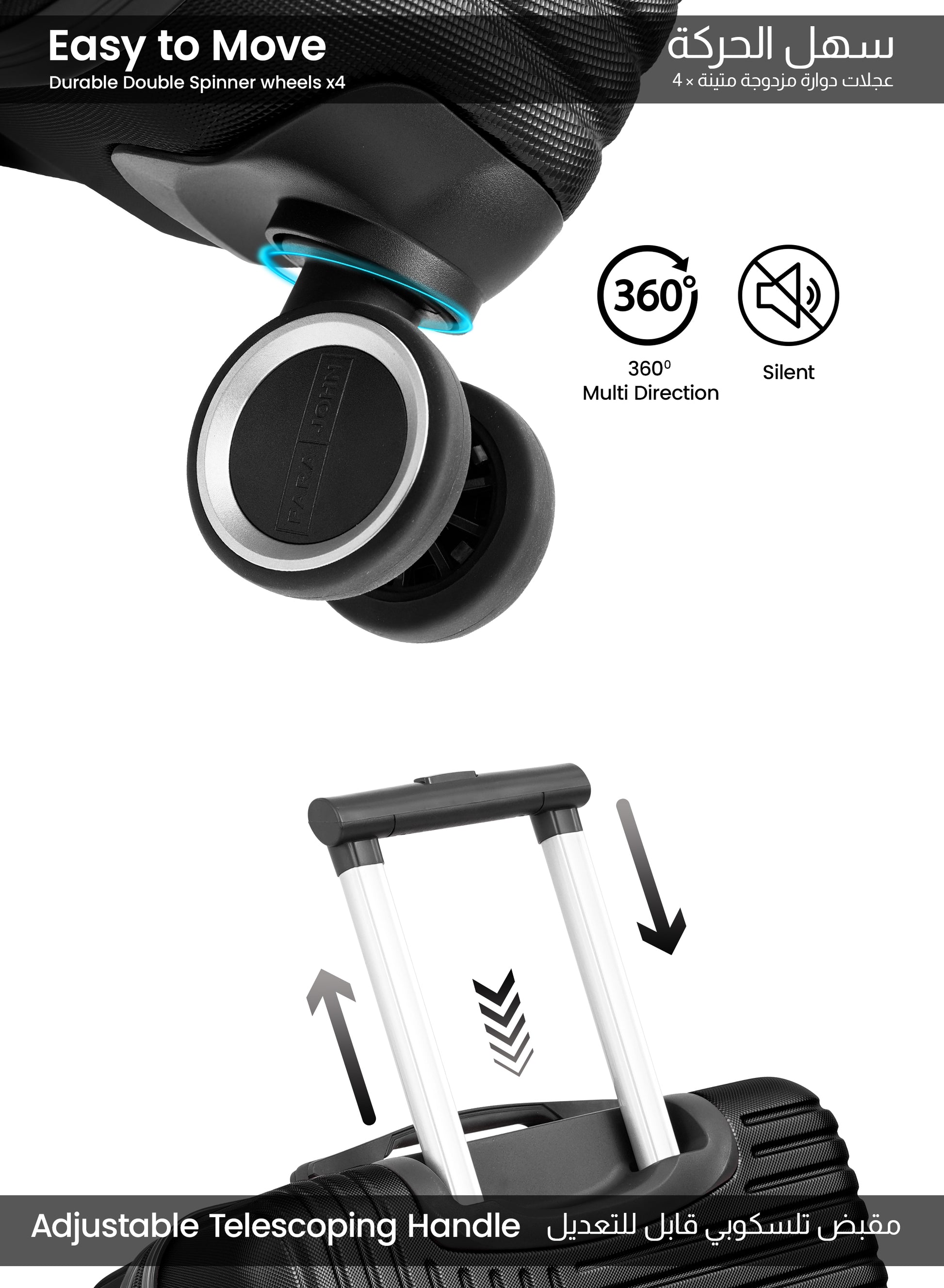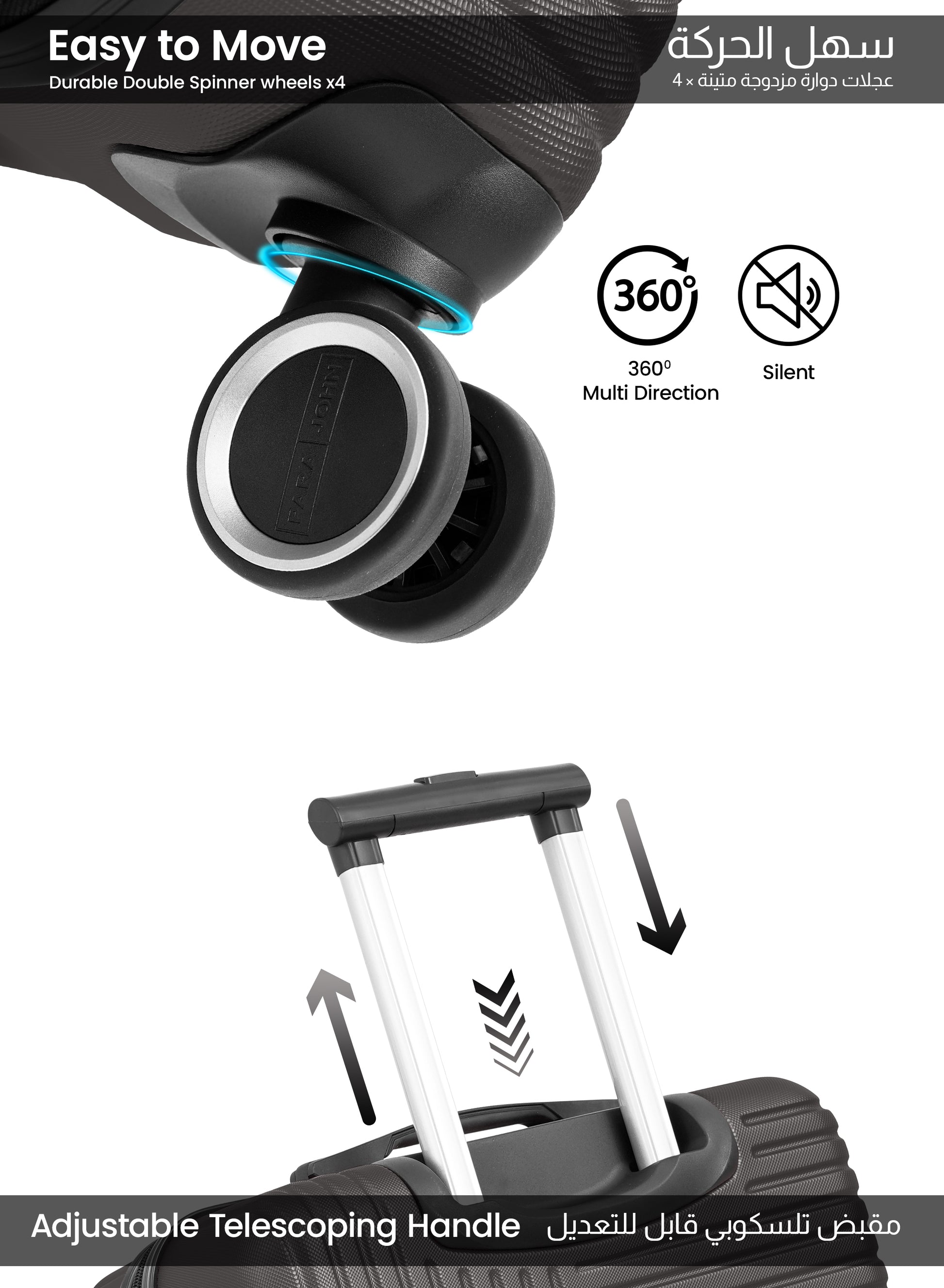 - عجلات دوارة 360 درجة : تنزلق بكل سهولة عبر المطارات ومحطات القطارات والشوارع مع حركة سلسة ومستقرة.